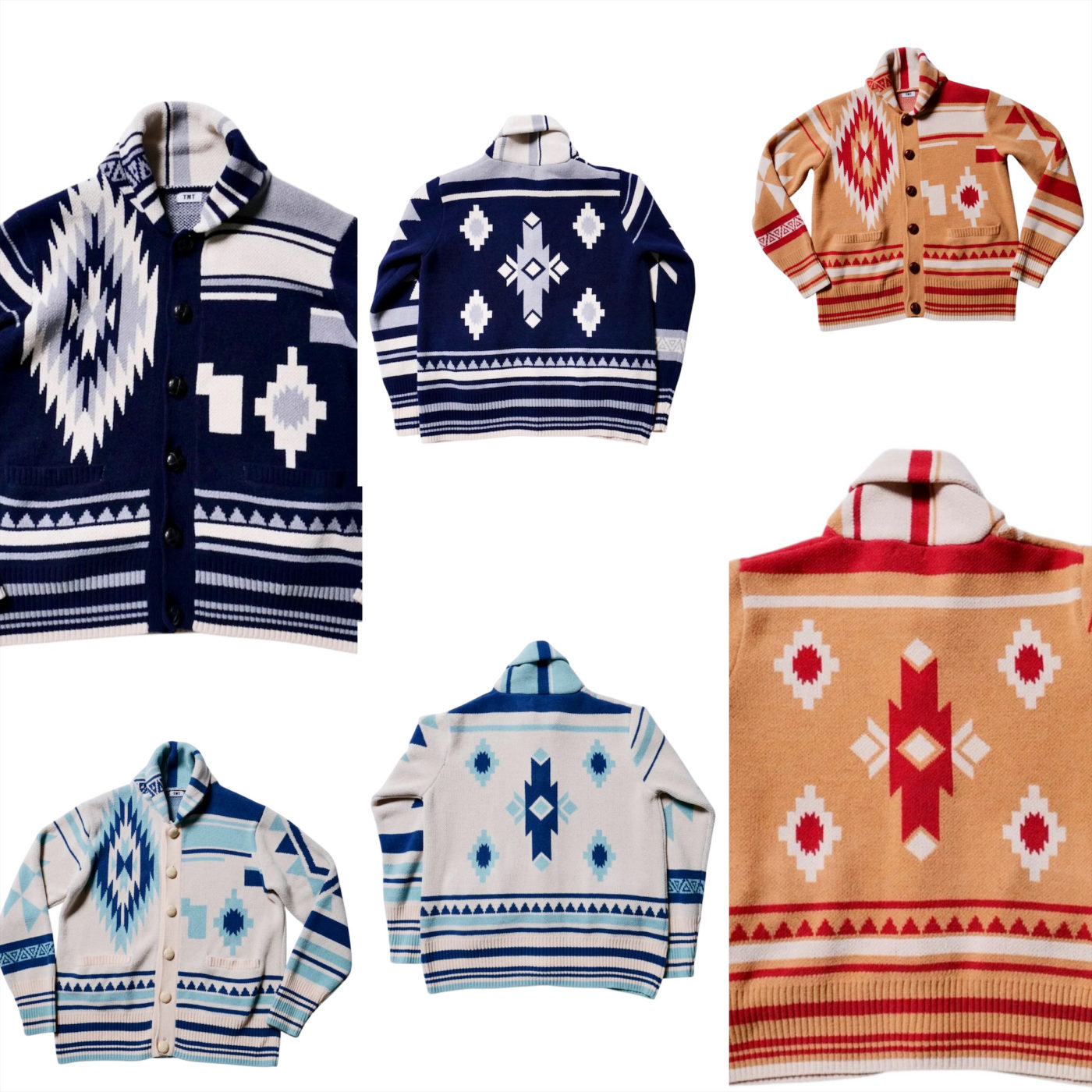 ナバホ族の柄をデザインソースに、あえて左右非対称にすることでデータ作成に非常に手間がかかり、手編みさながらな雰囲気に仕上げています。