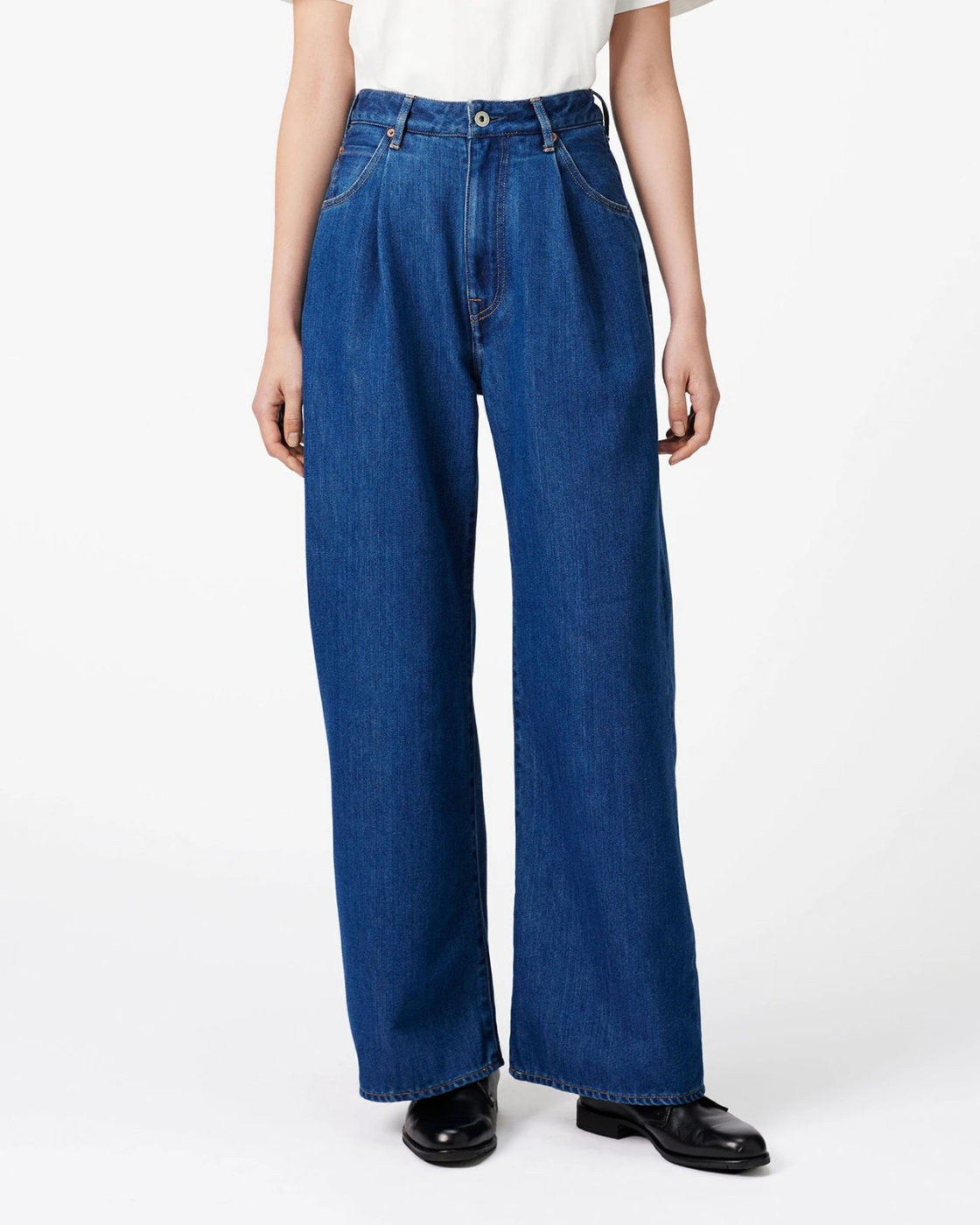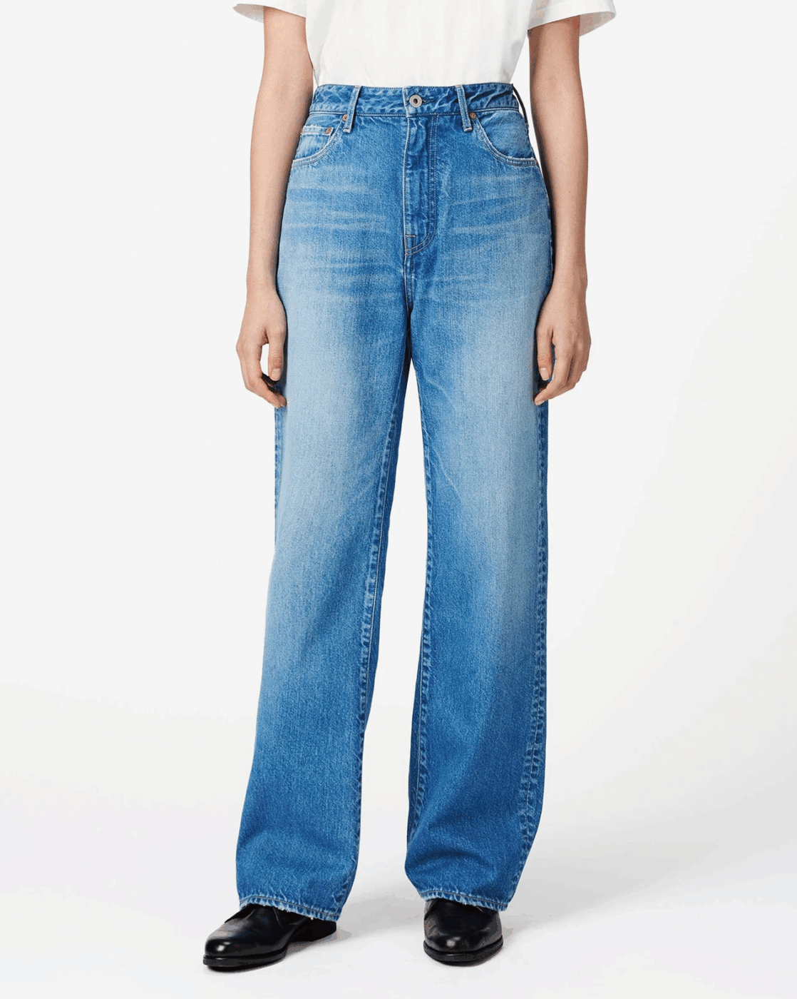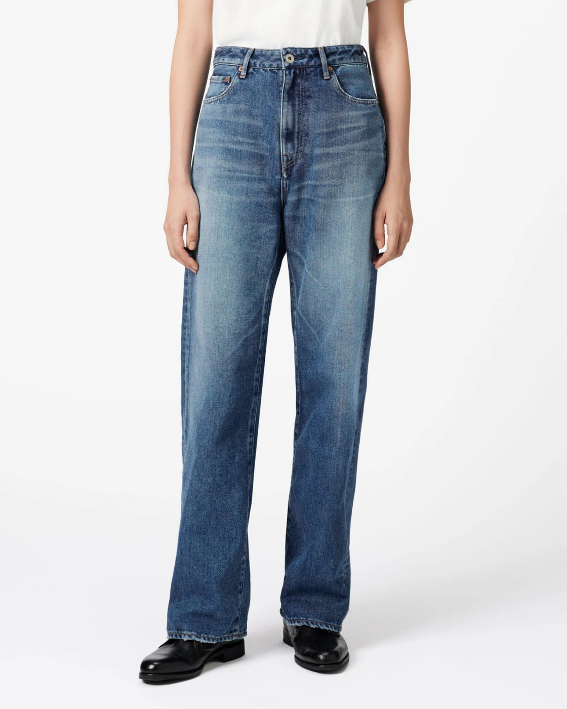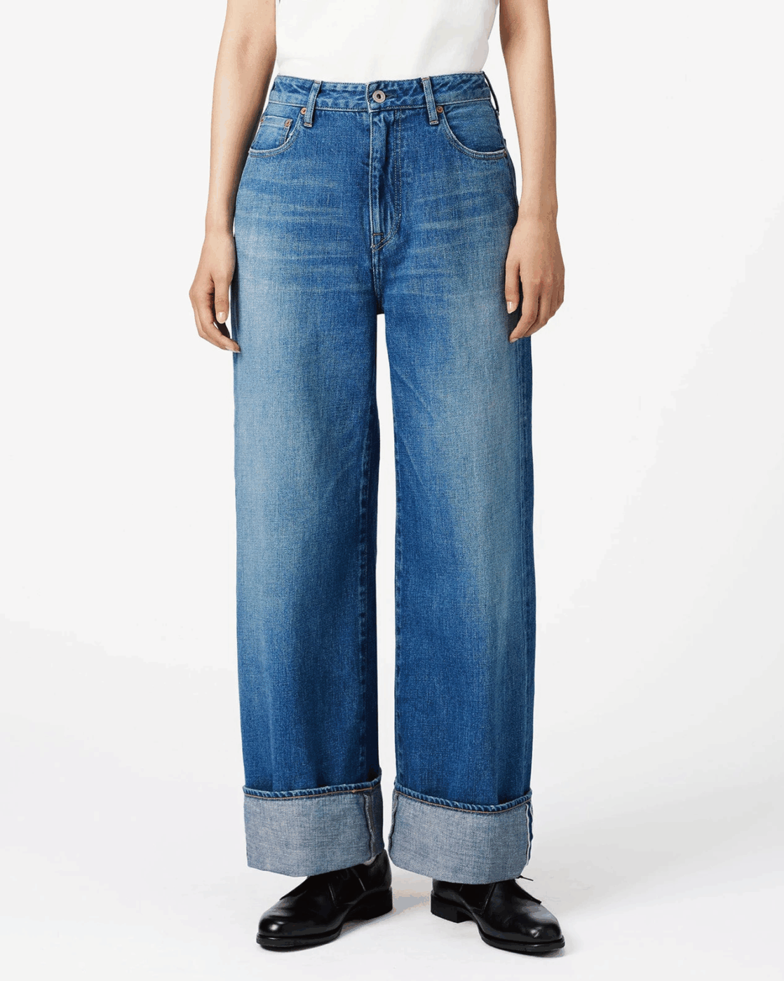裾に向かってボリューム感のあるワイドストレートシルエット。長めに設計されたレングスはロールアップを大きくすることでアクセントとなるような仕様にしています。セルヴィッチデニム特有のヴィンテージ然とした雰囲気と掛け合わさることで生まれる迫力と存在感のある力強い1本。