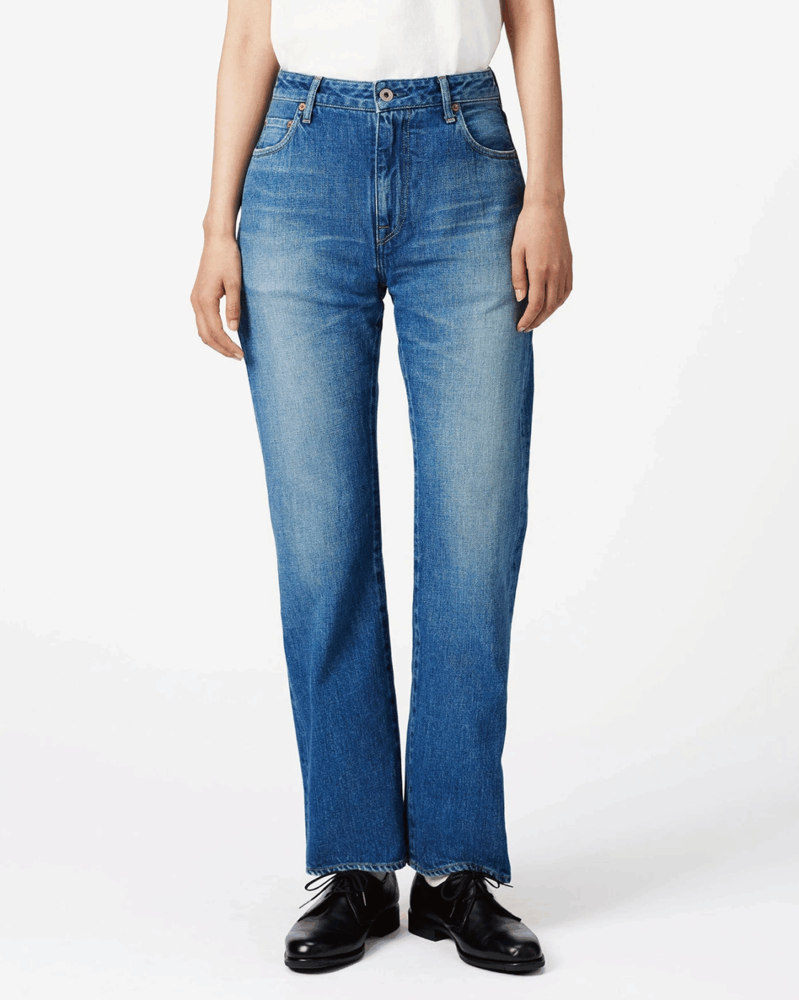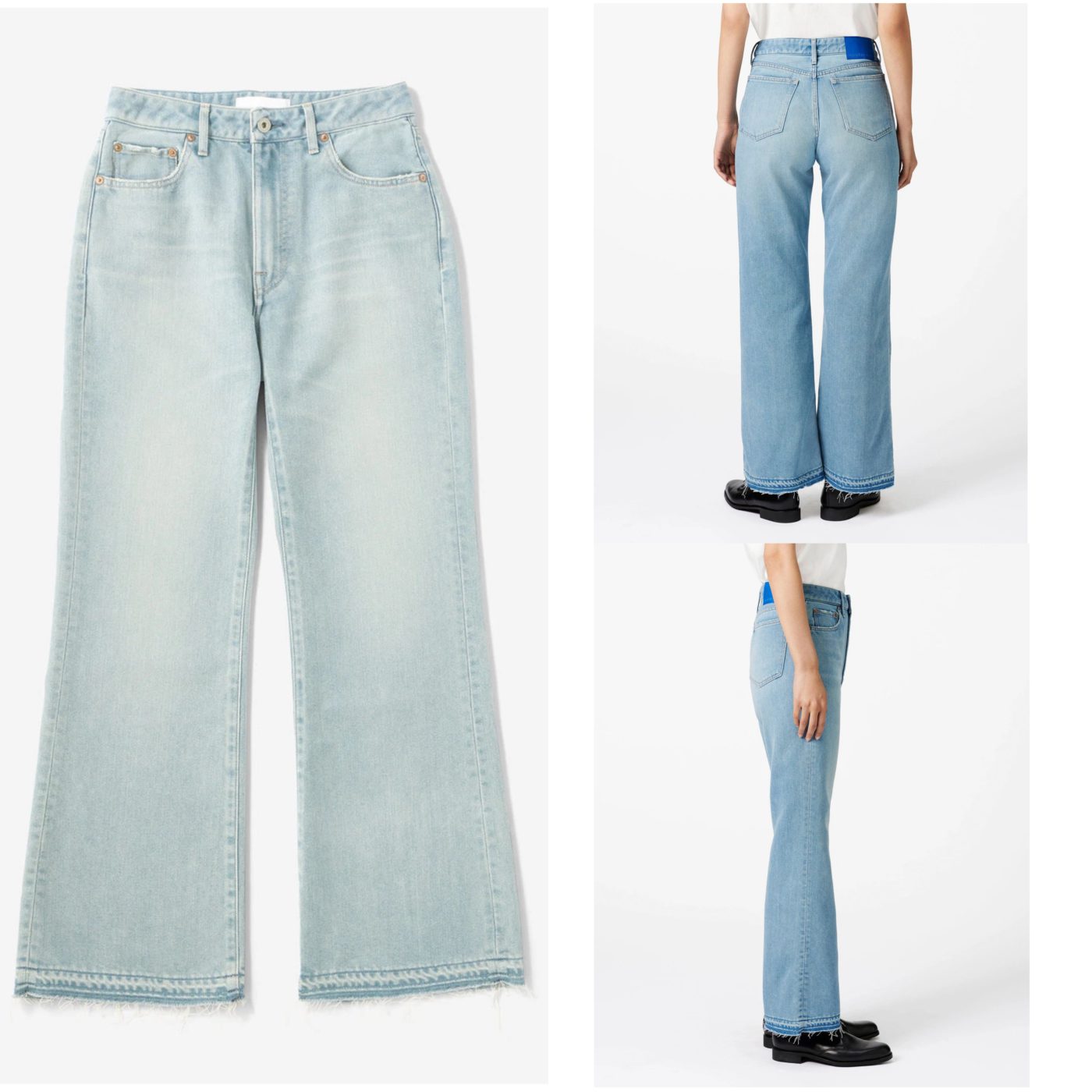ミドルライズのフレアシルエット。足のラインに綺麗なくびれが生まれるように設計。裾はカットオフ仕様にしたモデル。膝下から緩やかに広がるシルエットが美しいラインを作り、全体のバランスを構築。生地・シルエットともにヴィンテージ然としたフレアジーンズですが、現代的解釈によりアップデートされた1本。