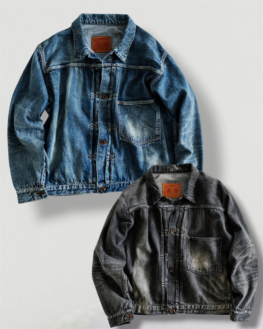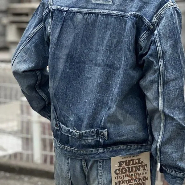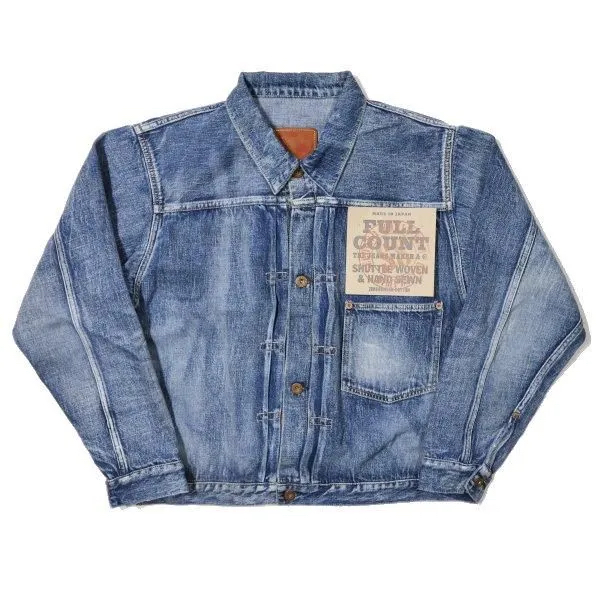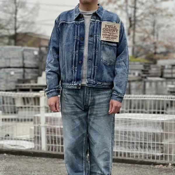 デニムジャケットは、「1st(ファースト)」とも呼ばれる、フルカウントの定番「2107 Type 1」をベースに、「大戦モデル」のディティールを追求。着丈は定番モデルより1cm短く設計し、ボタンも定番モデルが5つのところを4つボタン仕様に。