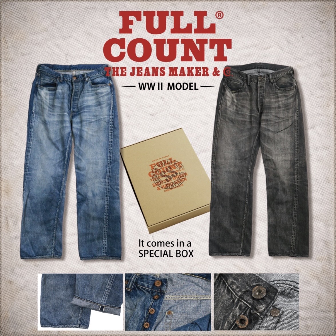FULLCOUNT(フルカウント)は、デニムマニアの中で一般的に「大戦モデル」と呼ばれる、第二次世界大戦中のヴィンテージジーンズのディティールを踏襲した、新たなリミテッドコレクションが数量限定入荷!!
